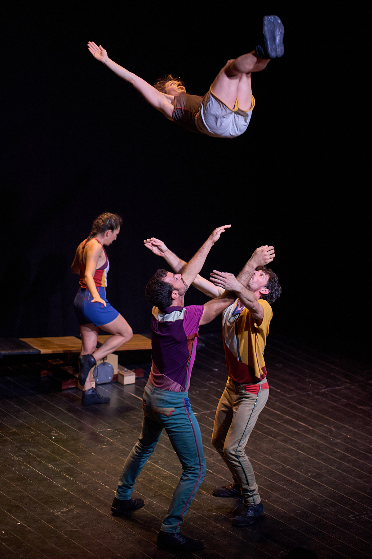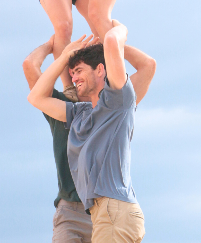 The group harnesses circus skills of group acrobatics, handstands and teeterboard, in order to express a sensitive and authentic human connection between its members.